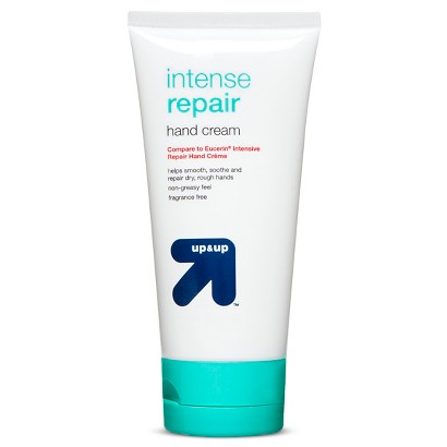 Second is the Up & Up Hand Cream Skin Repairing. This one says compare to Eucerin Intensive Repair Cream. It has a simple lotion-y scent and also is incredibly moisturizing, while also soaking in quickly. This one is a much smaller tube, so I threw it into my bag and have been using this one at work. I've been quite happy with it.